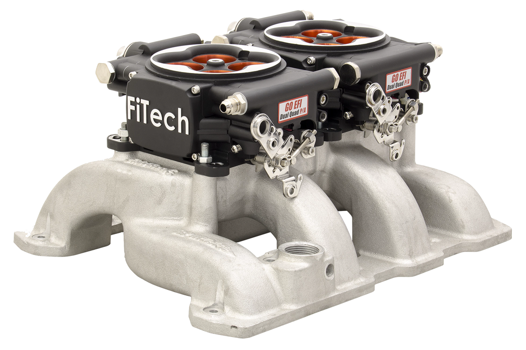 This Kit is for the guys who have 671 and 871 roots superchargers or make up to 1200hp naturally aspirated on their dual quad setup. FiTech EFI has made it simple with their Go EFI 2×4 Power Adder 1200hp self-tuning system. Works out of the box on your 2×4 blower plate as an inline setup or can be side mounted using custom linkages. Also, this kit is a bolt on for the most popular normally aspirated dual quad and tunnel ram manifolds including the Edelbrock line of dual quad manifolds without any adapters! They fit and look like they belong there because they were designed to fit from the start. One throttle body handles all of the brains while the second holds 4 additional injectors plus the IAC motor for idle stability. These can also be used in cross ram and tunnel ram configurations.