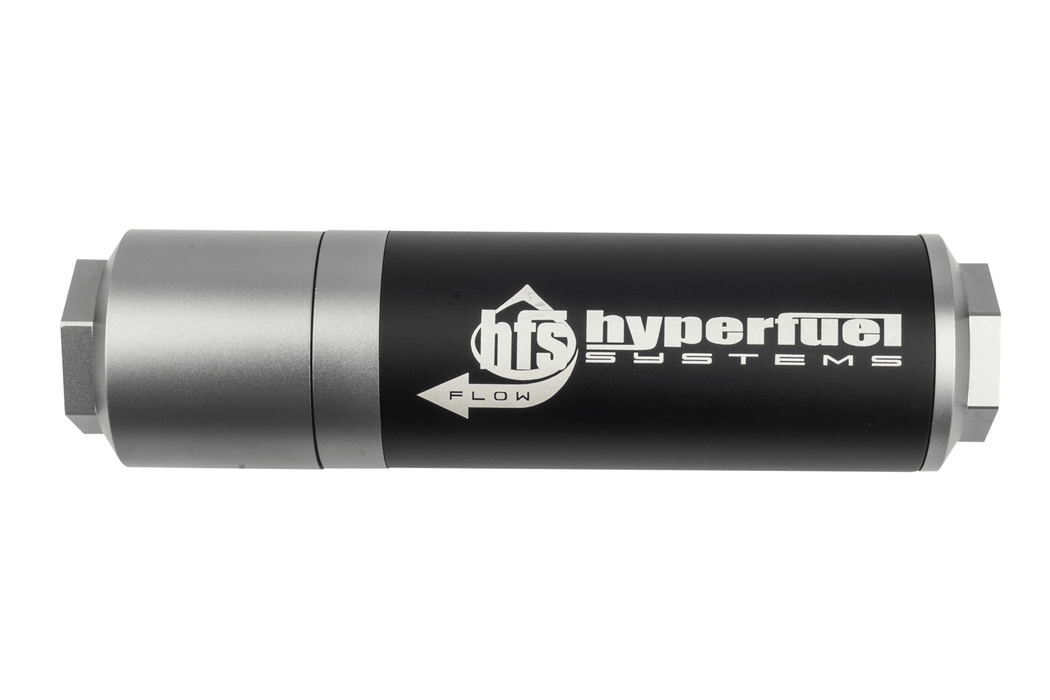 The HyperFuel™ premium 5¾” in-line filter check valve combos with 40-micron microglass element are designed to maintain fuel pressure for quicker startups, and to prevent a back flow with minimum pressure drop. These are a must when using multiple pumps. Female -08 AN O-Ring inlet and outlet CNC-machined from aircraft grade billet aluminum alloy. Dimensions: 5¾”L × 1½”O.D.; Recommended for use as a post filter. Supported filter media: cellulose, microglass SSD (anti-static), or stainless steel;