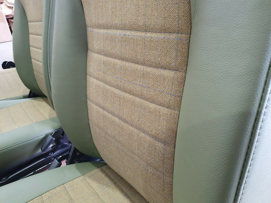 Cordings of Piccadilly Tweed and Italian hide leather upholstery on the front seats, high line cubby box/ arm rest, gear levers and rear side bench seats.